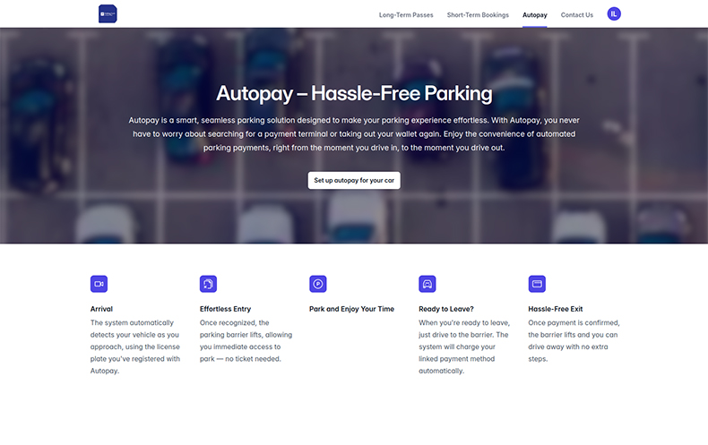 Autopago permite a los conductores registrar su vehículo y los datos de pago una sola vez. Después, pueden entrar y salir sin tener que detenerse en un terminal de pago. El pago es automático a la salida.